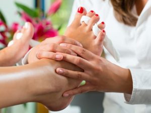 O corte deve ser feito de acordo com o formato da unha do indivíduo. Em seguida é a vez do polimento nas unhas e seu acabamento estético. Agora, os pés recebem creme hidratante, indicado no tratamento de fissuras. Por último, uma massagem vibratória especial com infravermelho. Tudo isso utilizando instrumentais esterilizados.